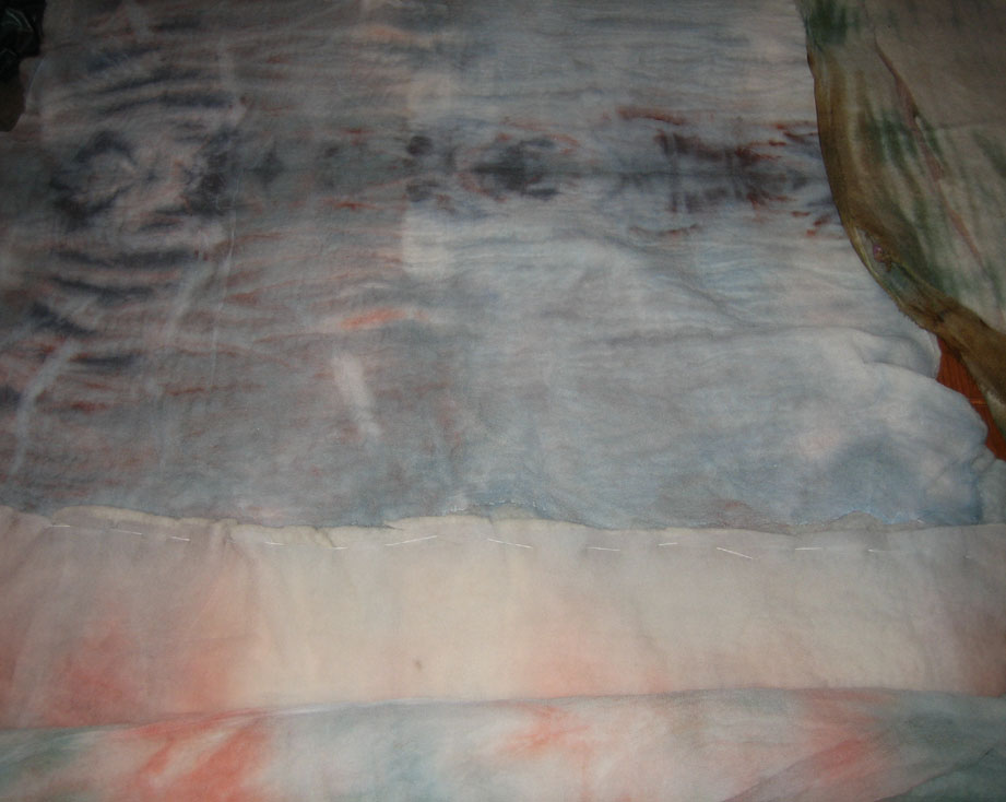 fabrics ready and drying stitching prefelts in a row with an overlapped seam of about 5cms –place them to suit you remembering the ones in themiddle will be at your backall now done silks drying in chosen shades