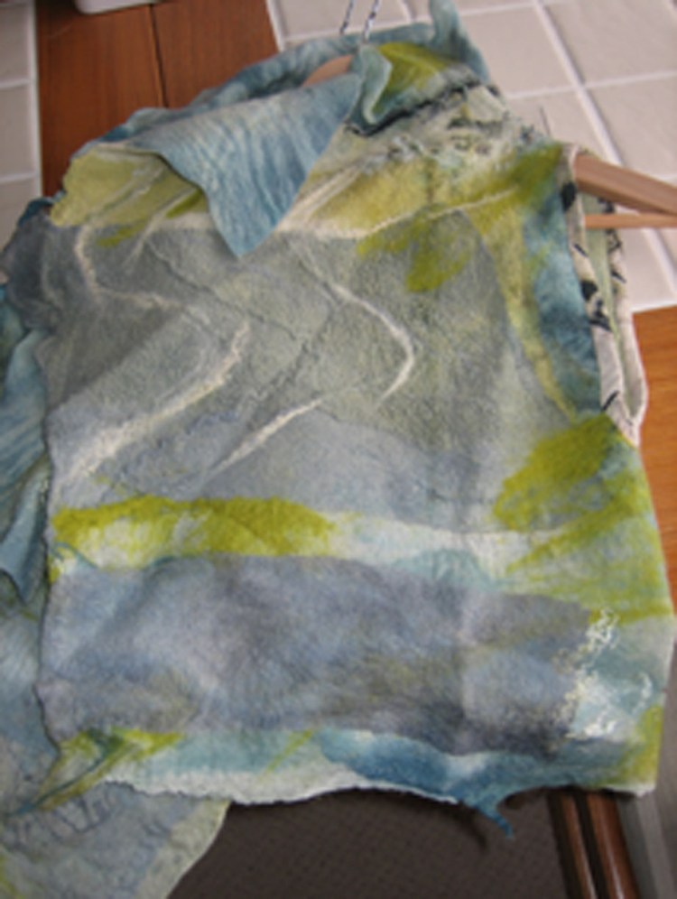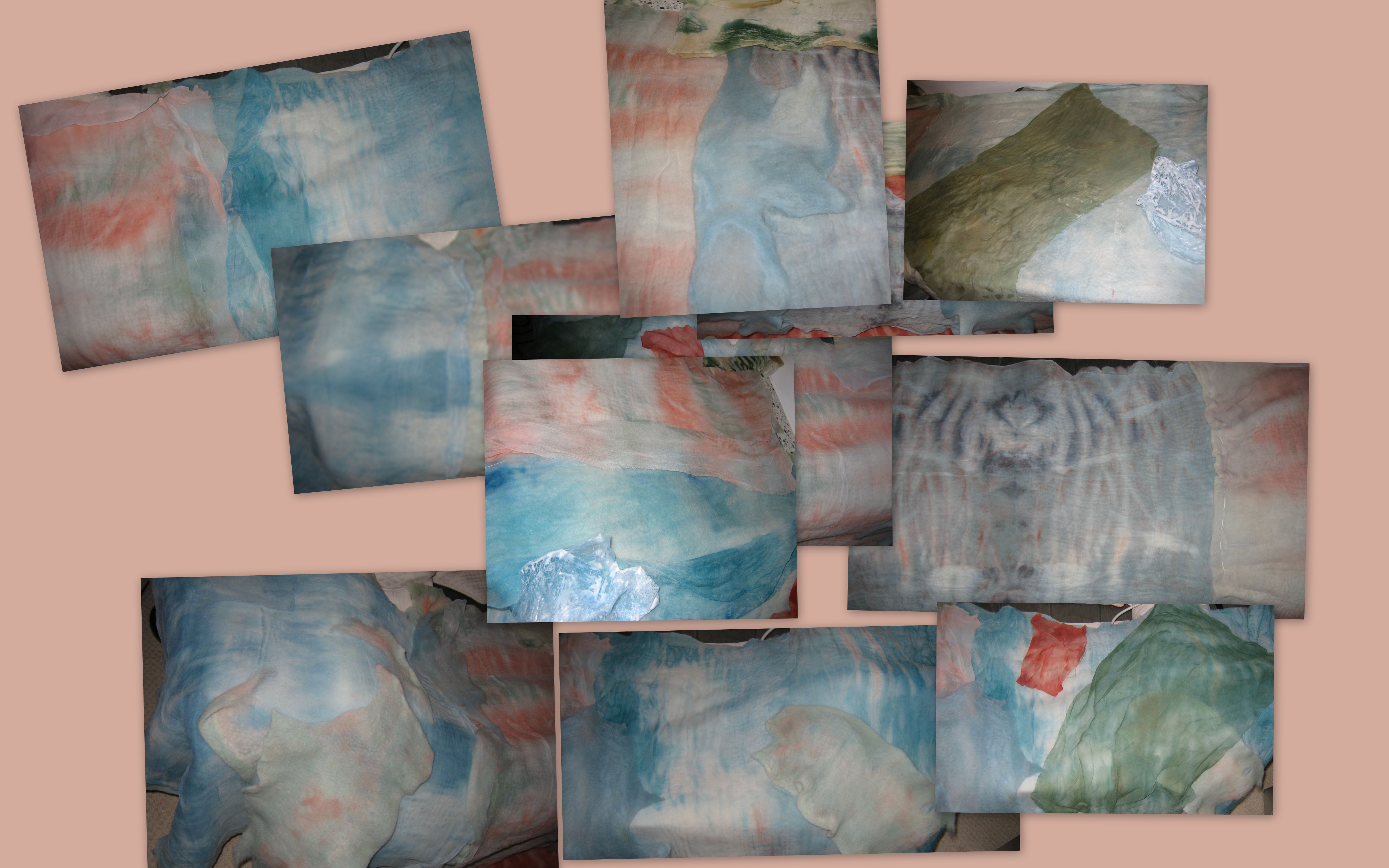 here is a collage of all the pieces joined together, and on the silky sides we will add extra prefelt pieces and on the felty sided we will place shibori dyed silks ,the aim is also to begin to combine our colour mixture and put the added colour for zing.