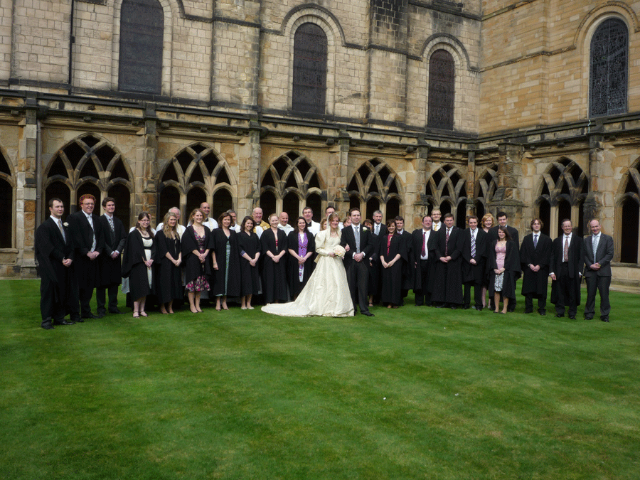 well ok I have had so many emails here is a picture of the bride and groom all the choir and all the priests who officiated at the wedding the photos are in the cloister garden enclosed within the cathedral the sun shone it was magic and now they are in Venice —oh isn’t love beautiful.click on for bigger image .Sure when they get back there will be better piccies my hand was shaking so much they are not brill.