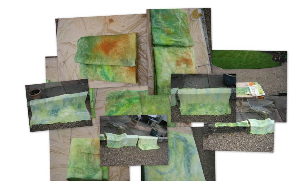 It took me so longto draft the pattern just to my size today that I have decided to make this without a resist.I am making large pieces of prefelt and silk which I am the dyeing with my chosen colours and setting .All fibre artists dye differently and I am no exception as I paint my dyes on dry then set then will play about piecing and adding more silk and fibre.Today I concentrated on the blues and greens to get dyed,dried and set.