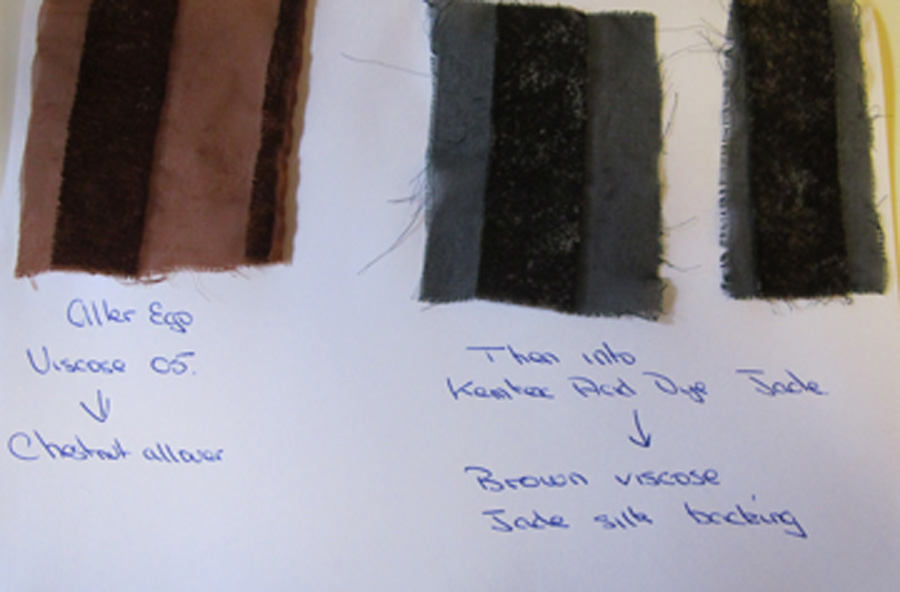 You can dye the silk and the viscose 2 differing colours it depends on the balance of the cationic and anionic charges between the fibres and the dyes,hmmm chemistry going on here thank goodness my husband is a scientist.1st dye is to dye the viscose –the darker part so far so good.