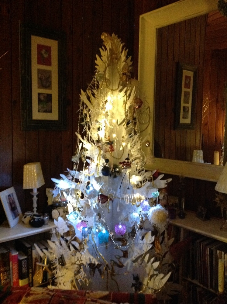This is the first year I have decorated the chapel after all our alterations and bookcases etc so it has been exciting.I made a descision not to have real trees inside,so I have a 7′ /2 metres white wooden tree and then buy a tree for my garden.