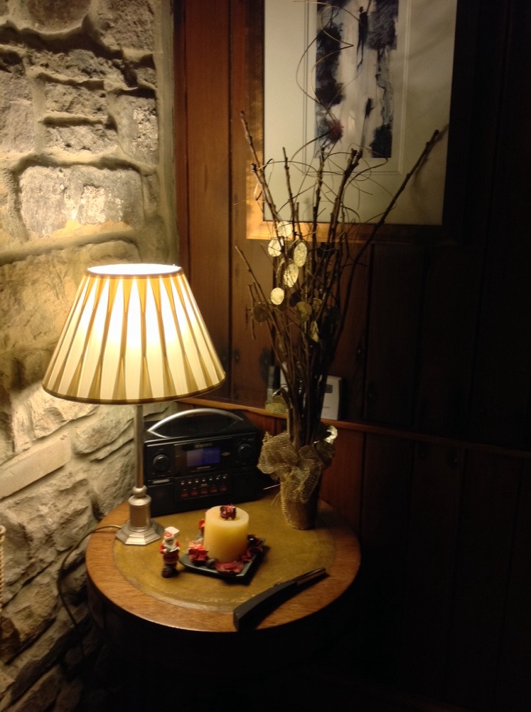 My small round table ,my radio table has the first ornament I bought when I was expecting my son.He has sat every Christmas somewhere in my lounge area,sometimes he gets forgotten at 12th night and I catch sight of him weeks later.