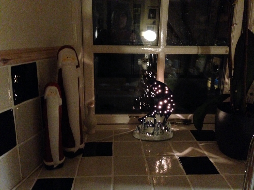 In the kitchen my lighted Moon house shines as it has done for over 15 years now.Santas stand proud on guard normally over the Christmas cake.