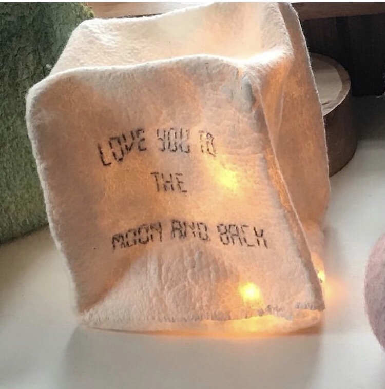 Using fibres and paper together we create a cube contain img lights and stencilled words on our paper prior to Felting